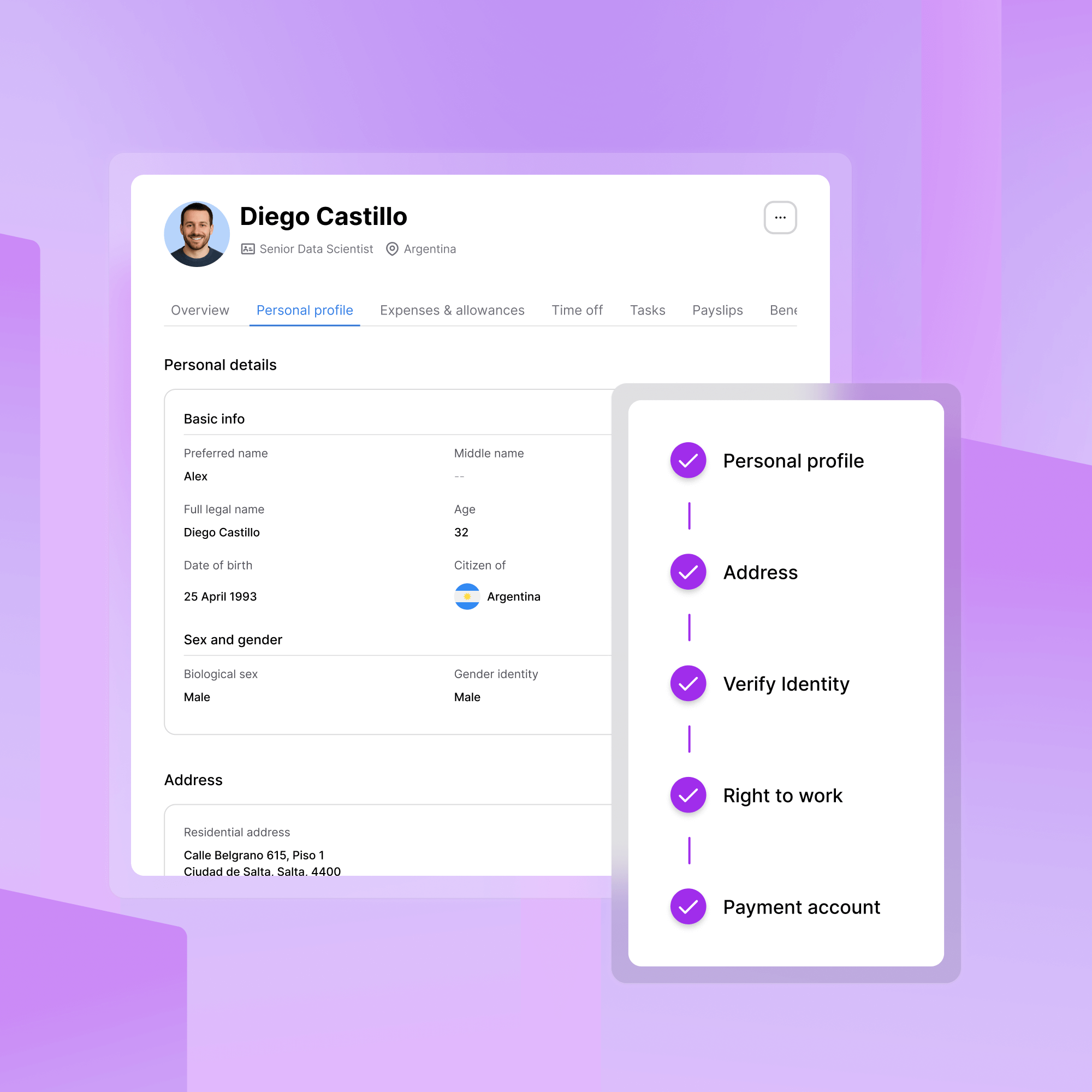 Onboard faster with a simple, intuitive flow that collects everything you need from day one. Employees complete their profiles in minutes with smart forms that guide them through each step.
