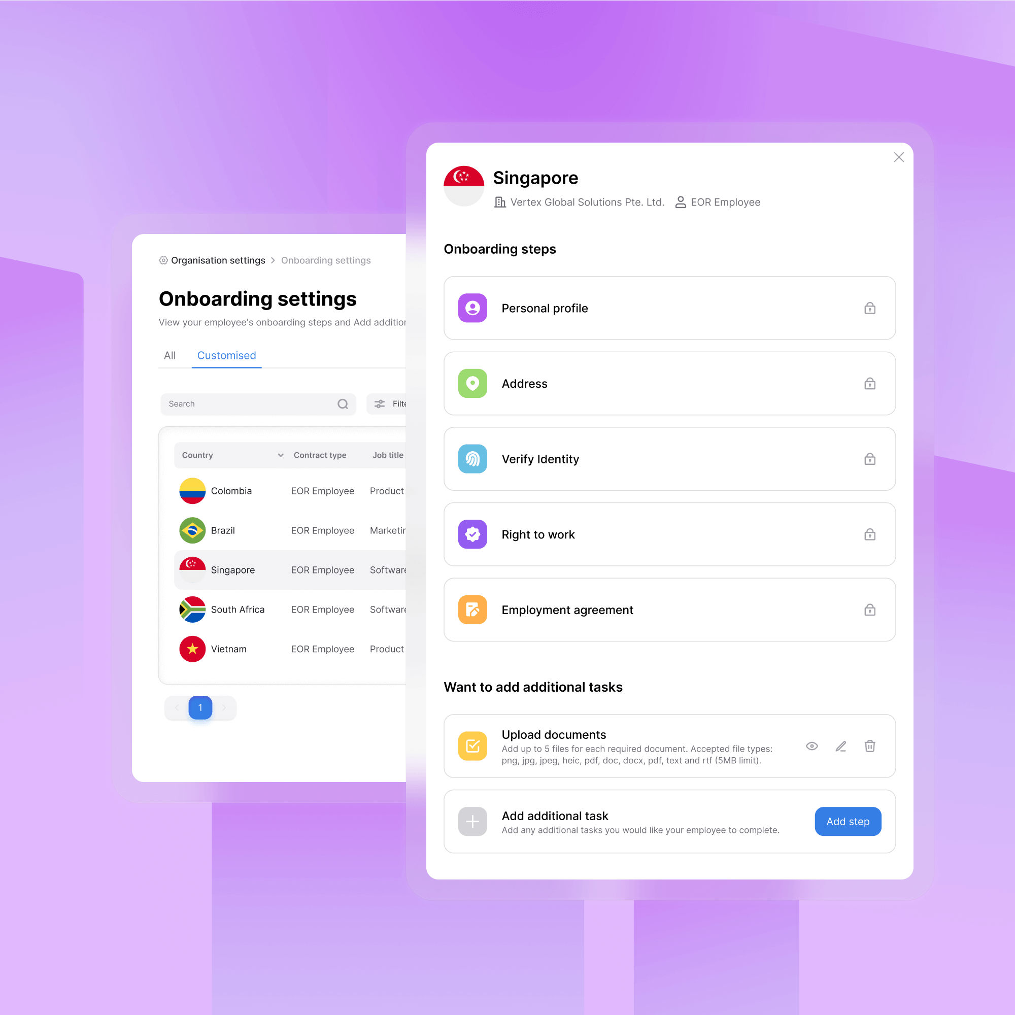 Automated, country-specific Right to Work flows that capture exactly what’s required for each jurisdiction. Speed up verification and reduce compliance risk with workflows that adapt to local regulations.