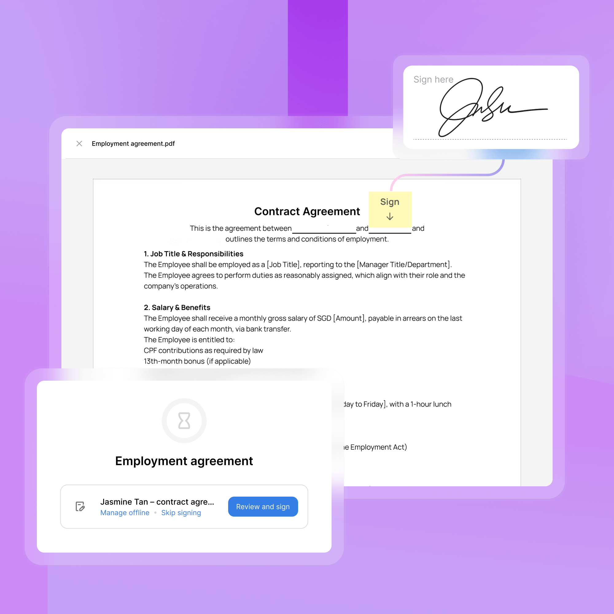 Generate compliant, ready-to-sign employment contracts directly from the platform. Choose digital signatures for instant execution or download for offline signing – your workflow, your way.