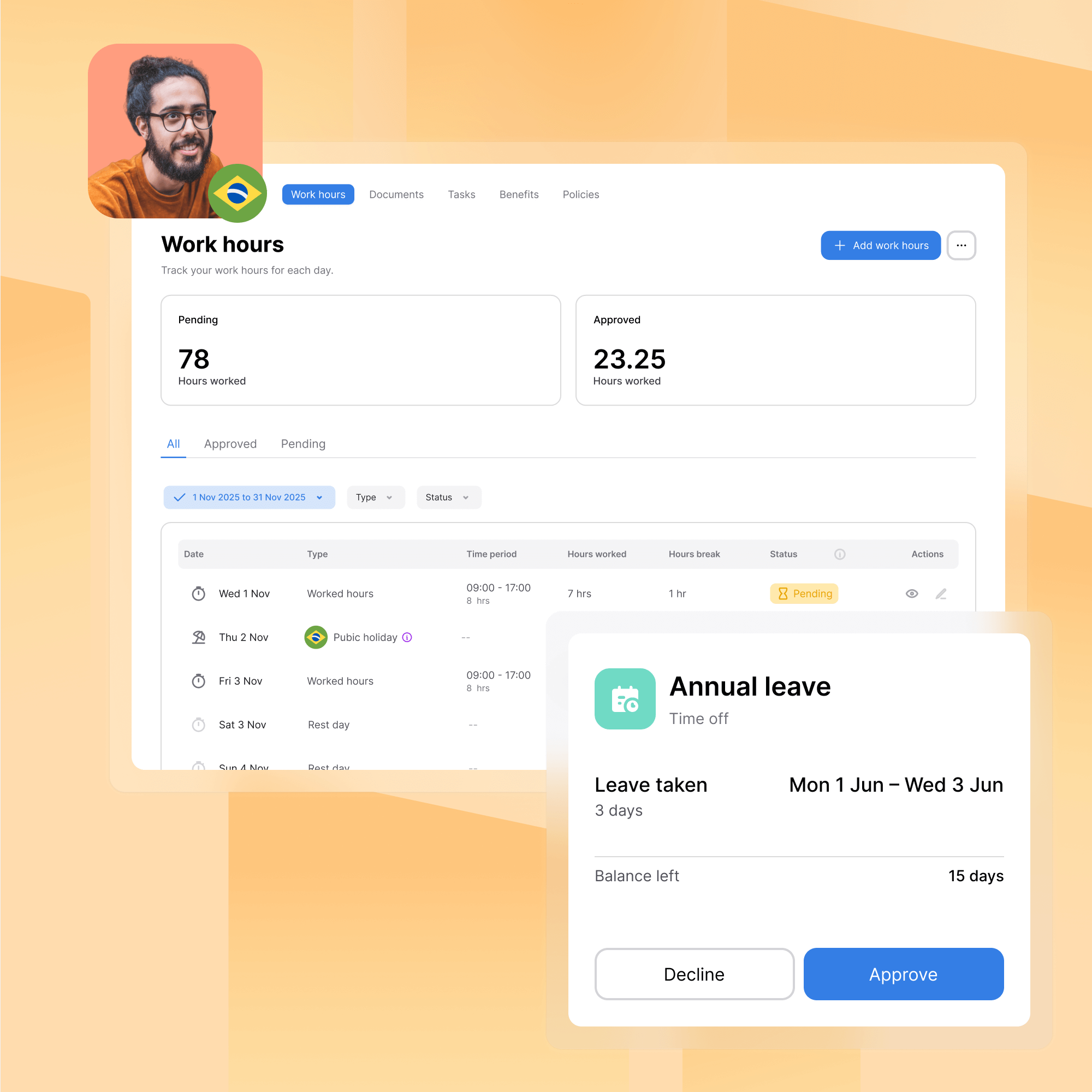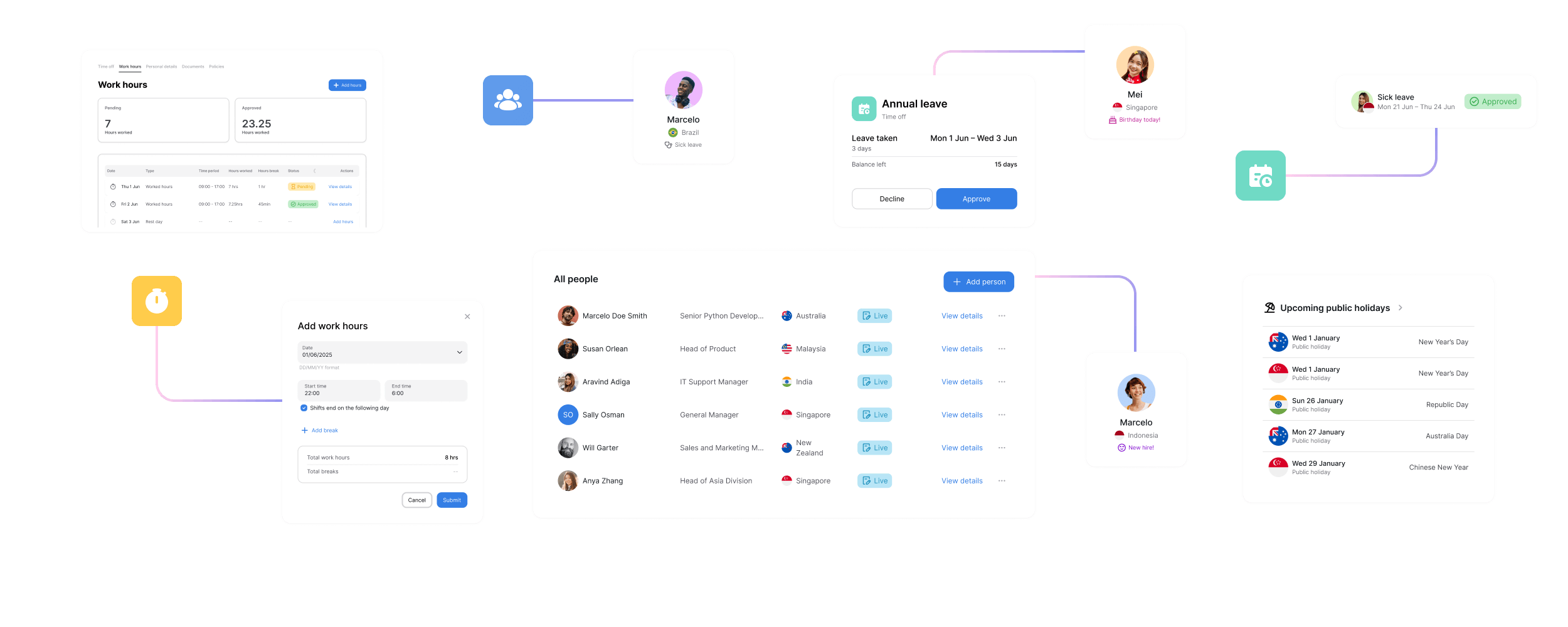 One platform for your entire global workforce. Manage employee data, time tracking, leave, and expenses across all countries—with local compliance automatically built in.