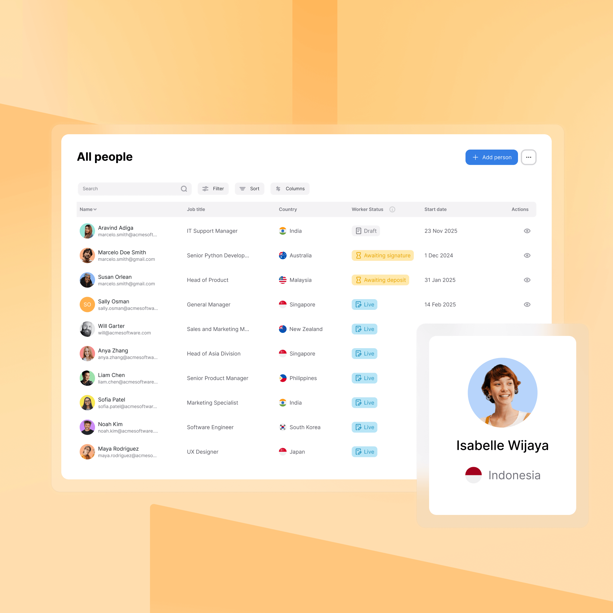 A central hub for all employee and contractor profiles – organized, searchable, and always up to date. Find anyone instantly with powerful search and filtering. Track employment history, documents, and changes over time.