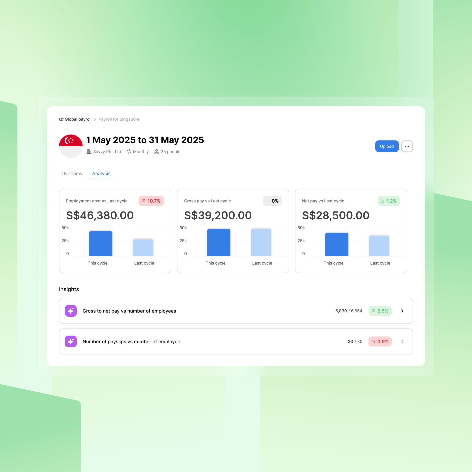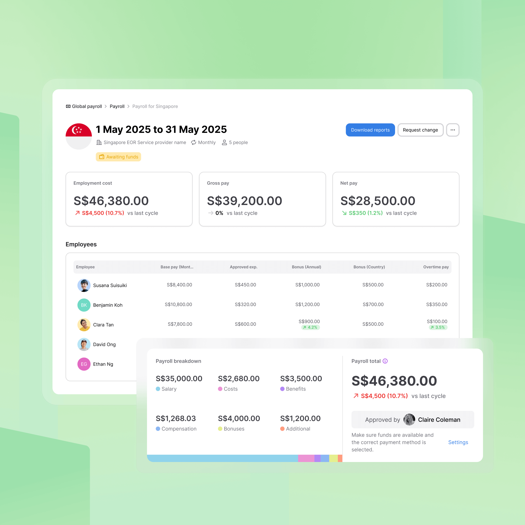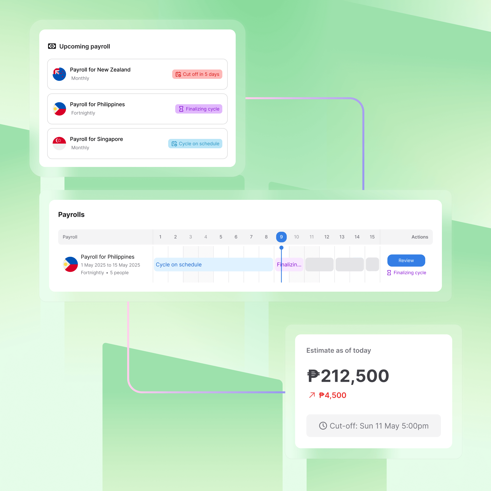 Manage all payrolls across countries in one central dashboard. Get instant visibility into payroll status, track processing milestones, and coordinate seamlessly with In-Country Providers—no more jumping between systems or spreadsheets.