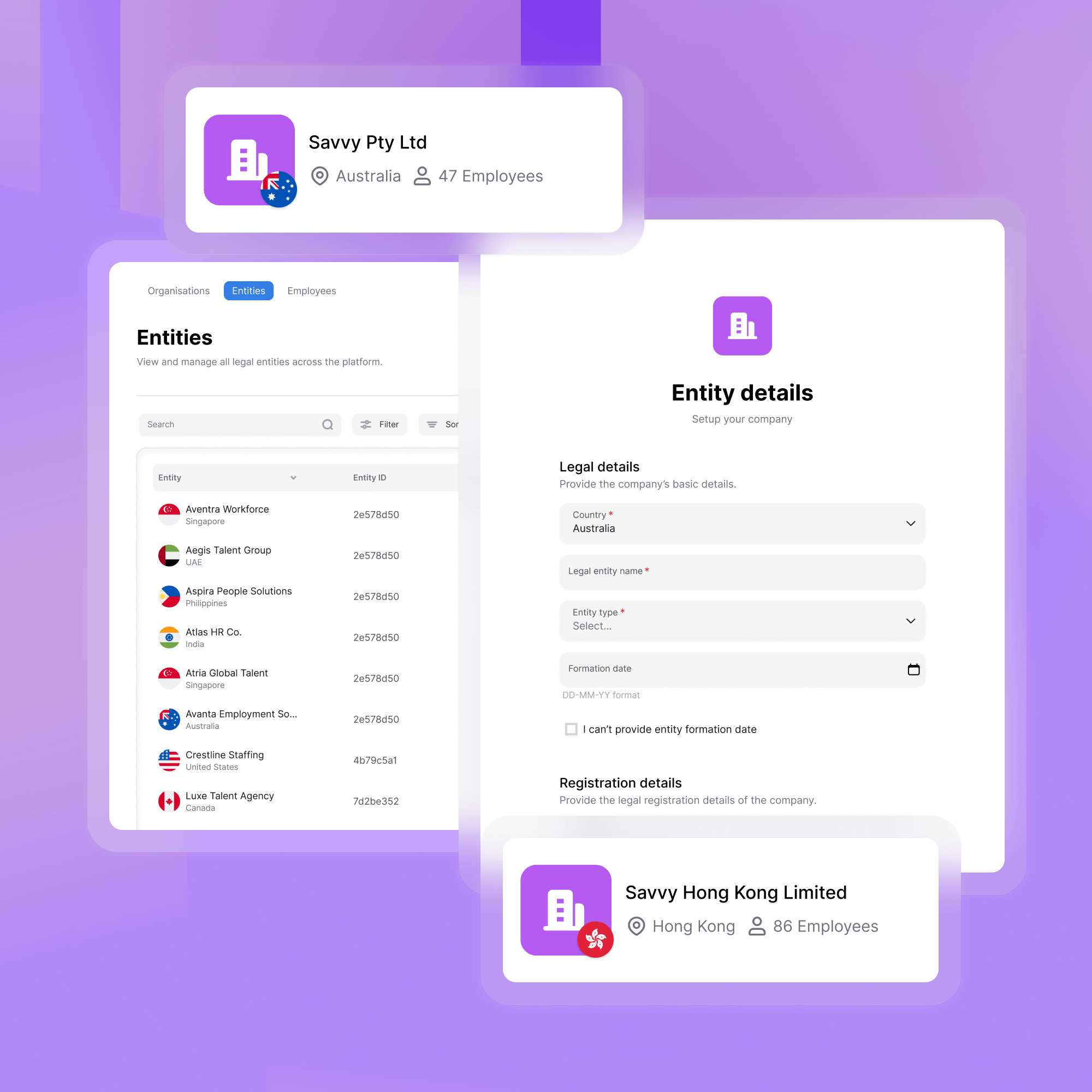 Configure and manage your own hiring entities to expand service delivery. Add legal entities, define their capabilities, and control which clients they serve—all from the admin panel.